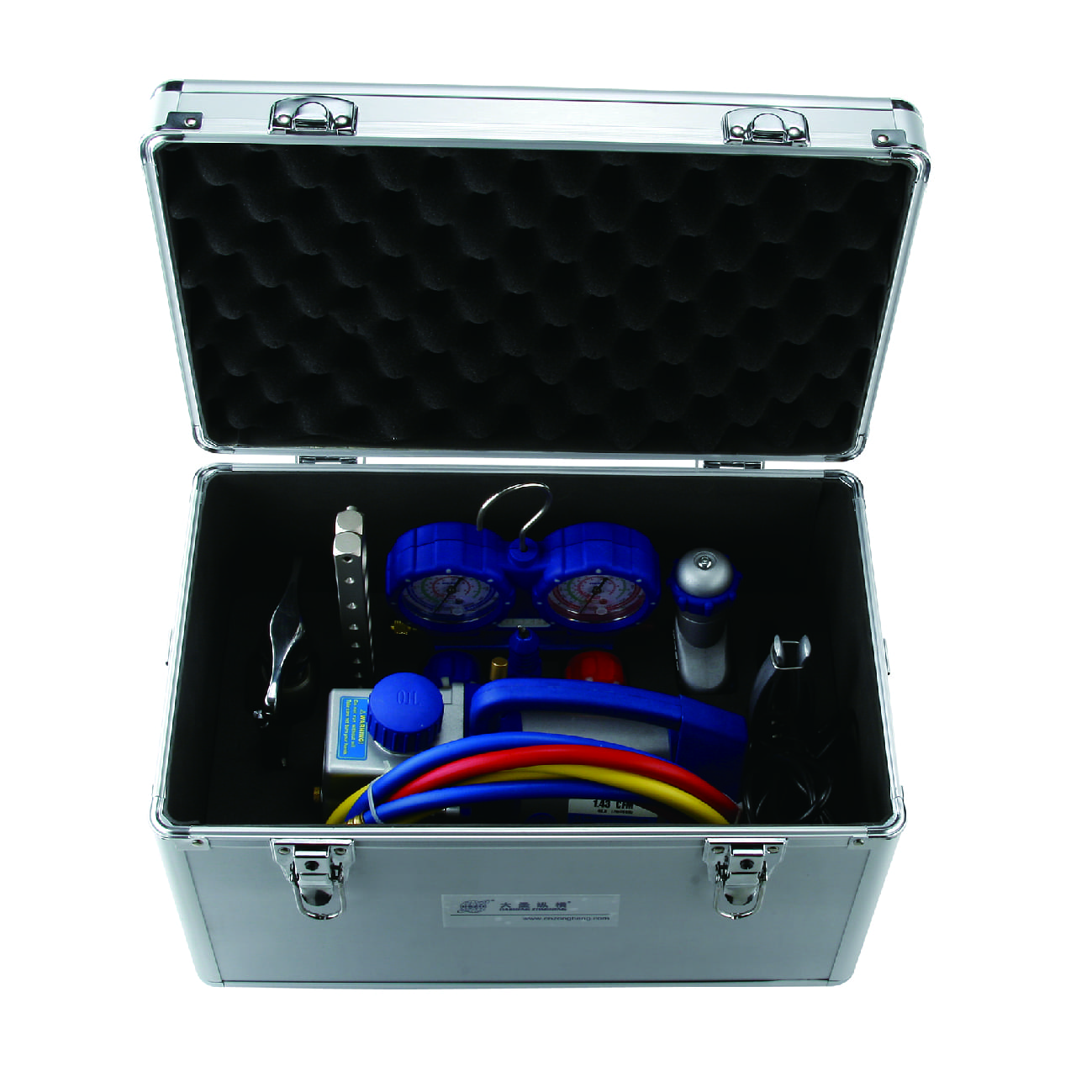 Шланги заправочные длина 150 см (3 шт). 1 шланг (1/4 SAE x 1/4 SAE) 2 шланга (1/4 SAE x 5/16 SAE), Труборасширитель эспандерного типа VK-622, Труборез VK-532, Риммер карандашного типа VK-809 с запасными режущими ножами (2шт), Аллюминиевый кейс для транспортировки, Ремень для кейса, 2 ключа для кейса в комплекте."